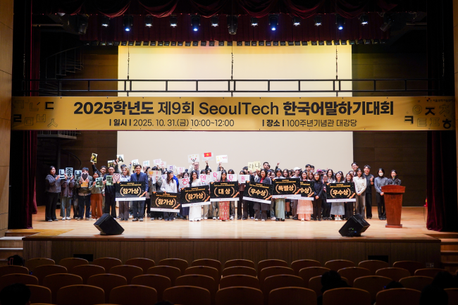서울과학기술대학교 국제교류처는 10월 31일 100주년기념관 대강당에서 제9회 SeoulTech 한국어말하기 대회를 개최했다. 이번 대회는 한국어과정 학생들의 말하기 능력을 향상시키고, 본교에 재학 중인 어학연수생과 외국인 유학생, 교환학생들의 한국 문화에 대한 이해를 높이기 위해 마련됐다. 행사에는 한국어연수생을 중심으로 외국인 유학생, 내국인 학생, 한국어 강사, 심사위원, 국제교류처 관계자 등 총 400여명이 참석해 대회에 대한 높은 관심을 보였다. 행사는 개회 선언을 시작으로 국제교류처장과 국제대학 글로벌한국어문화학부 이경 교수의 인사말이 이어지며 본격적으로 진행됐다. 이후 본선에 진출한 8명의 참가자가 1부와 2부로 나뉘어 한국어 말하기 발표를 진행했다. 참가자들은 한국에서의 생활 경험, 문화적 차이에 대한 생각, 자신의 성장 과정 등을 주제로 발표하며 그동안 갈고닦은 한국어 실력을 선보였다.