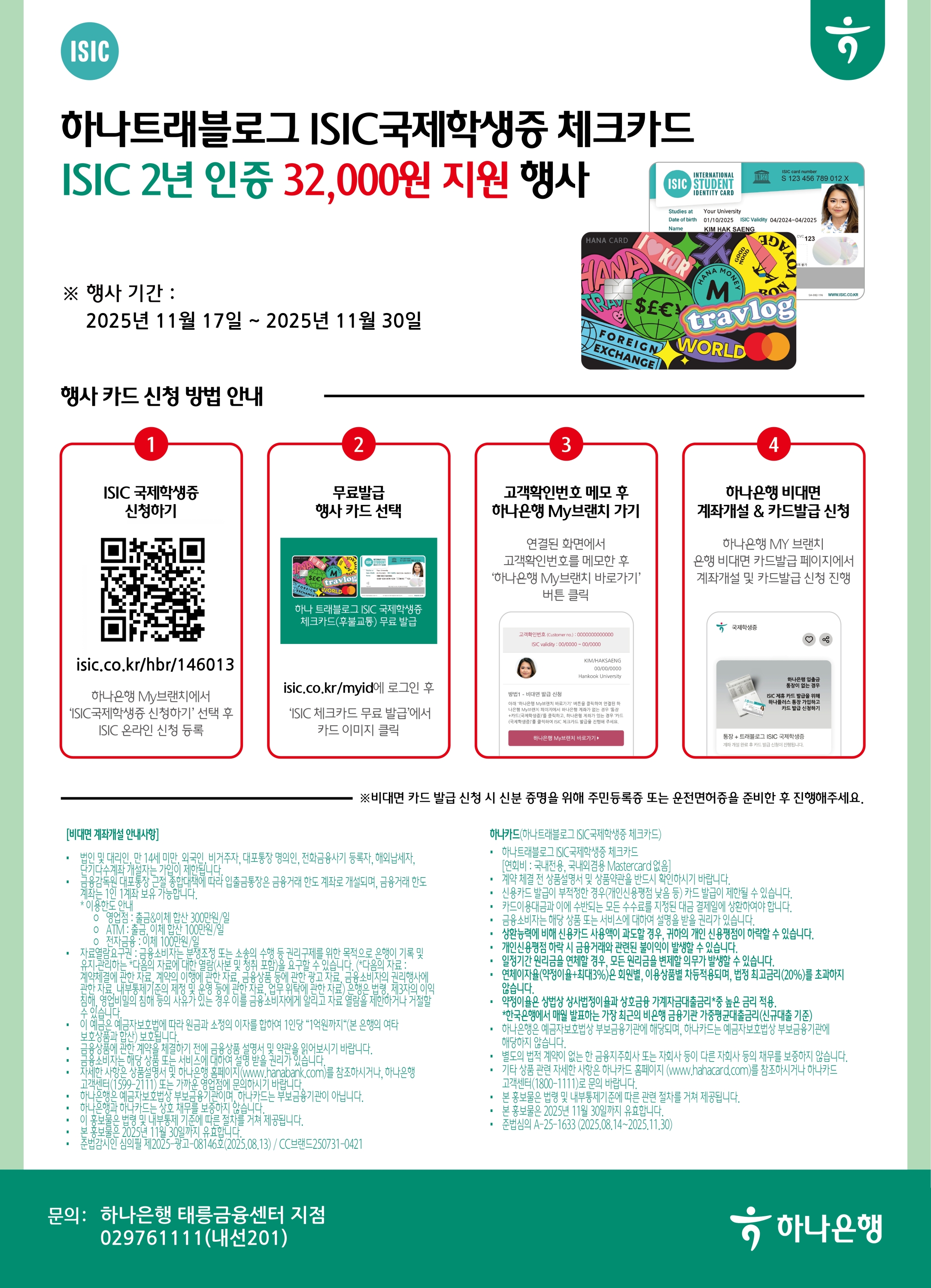 5. 발급비용 : 무료 (발급비 32,000원 하나은행 부담)