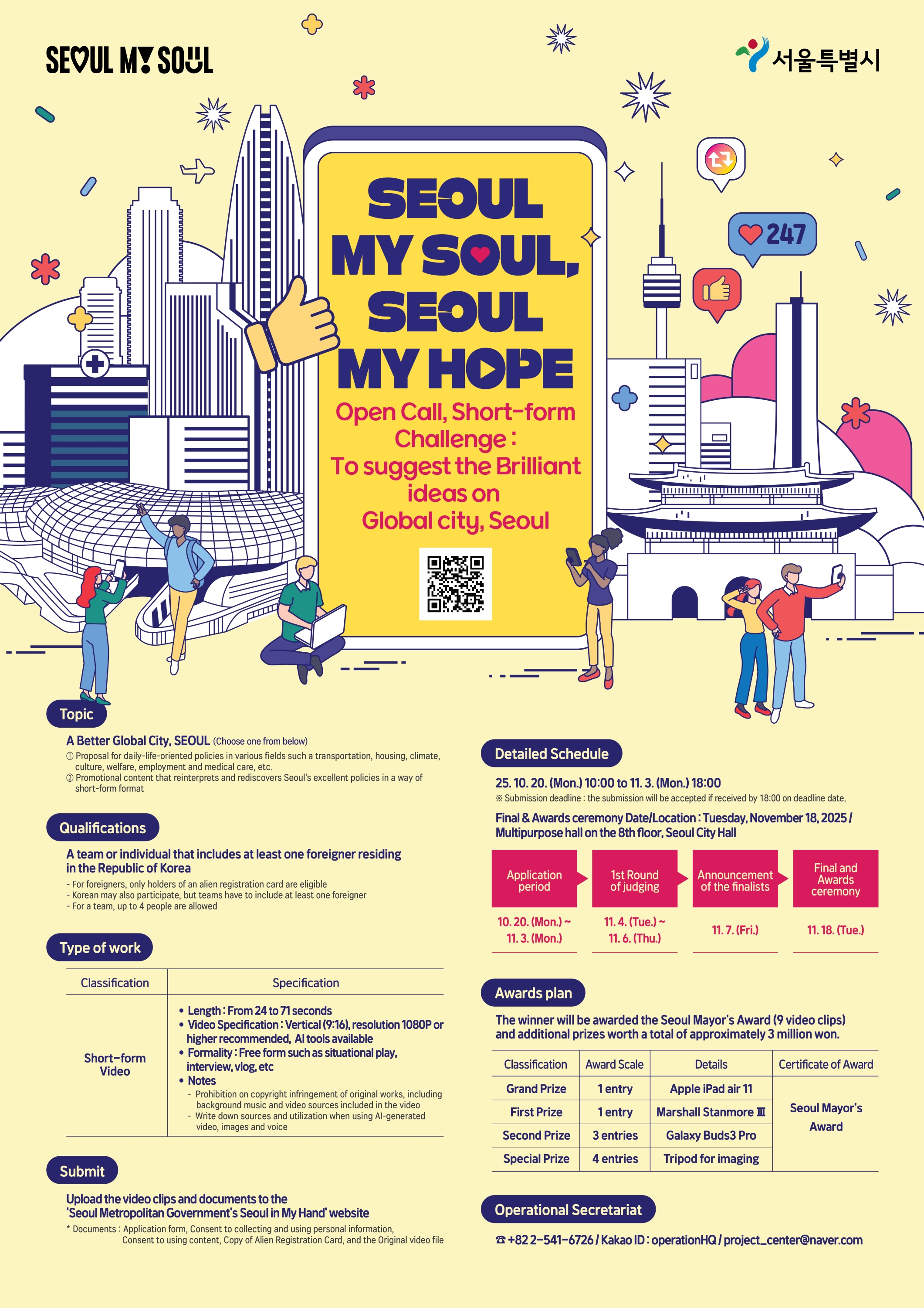 | Title | 글로벌 서울 아이디어 제안 숏폼 챌린지 (Seoul My Soul, Seoul My Hope) | Date | 2025-10-02 | ReadCount | 19662 |